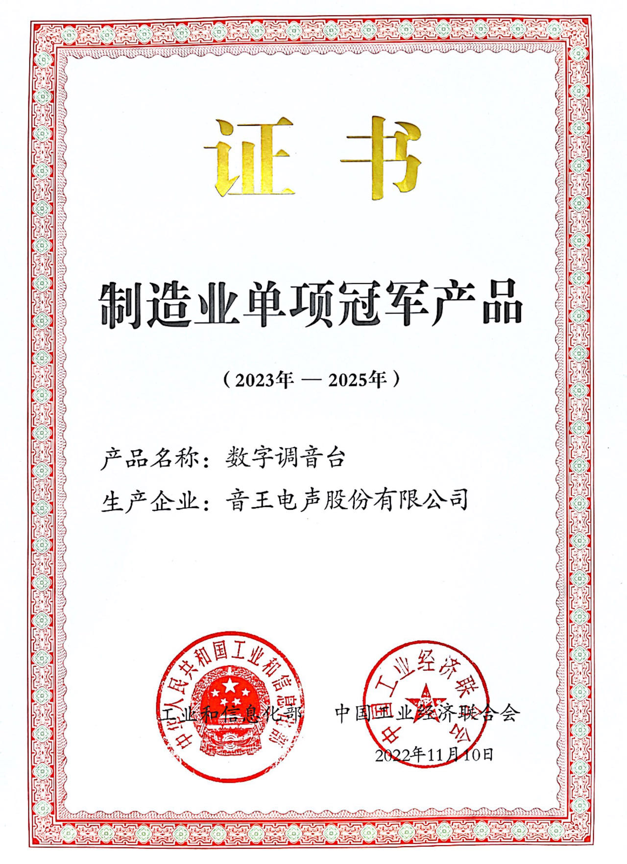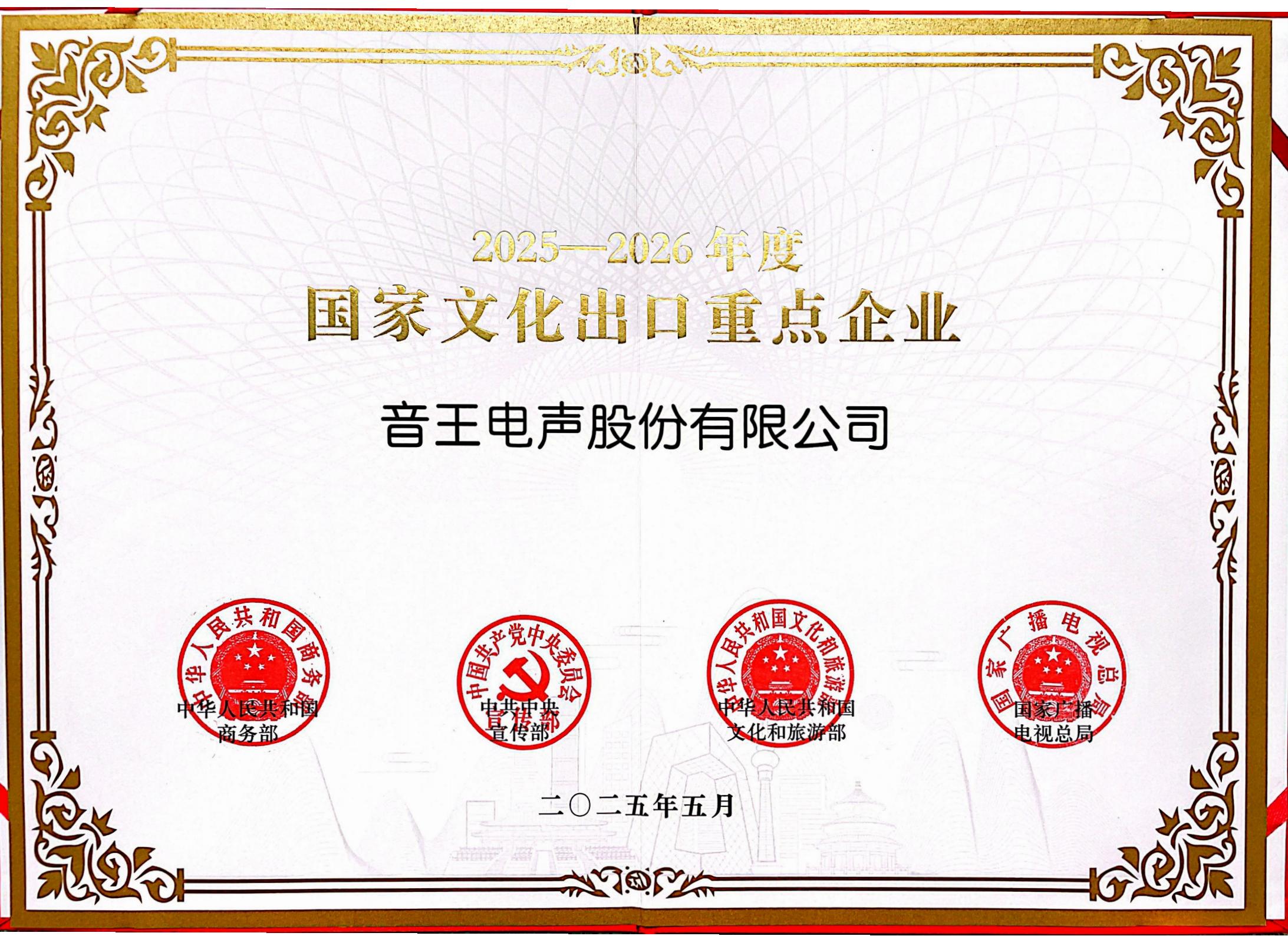 音王擁有“國家企業技術中心”、“國家文化和科技融合示范基地”、“ 國家制造業單項冠軍”、“沉浸聲文化和旅游部技術創新中心”等數十項國家級平臺及殊榮。全球設有22個研發機構,獲得600余項發明及實用專利,成為國家級專利示范企業。2025年經國家權威機構評估音王的品牌市值已達47.2億元。