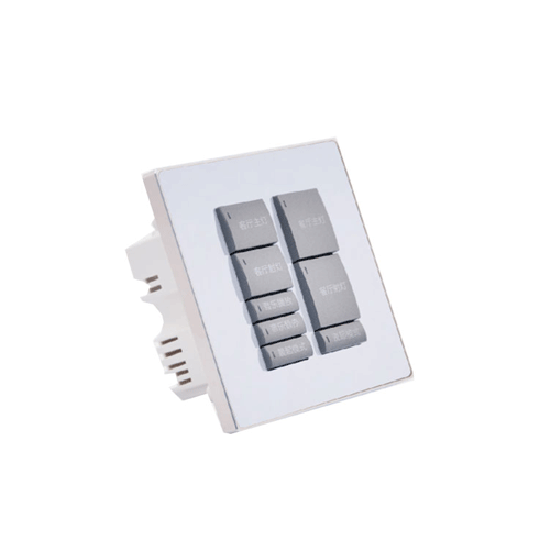 86式可編程輕觸面板;可編程輕觸面板;客戶可自定按鍵數量(6~14 鍵);2路IO輸入,可接傳感器輸入;按鍵可自行打標文字、圖案;每個 按鍵都在獨立的狀態反饋指示燈;多種面板材質選擇高雅而又尊貴; 設備ID號可通過拔碼開關設定,安裝維護方便;型號后綴X表示面板 材料及顏色,可選:0鋁銀色/3鋁香檳金色/6玻璃黑色/9玻璃白色;標 準86式墻身底盒安裝方式,安裝拆卸方便。