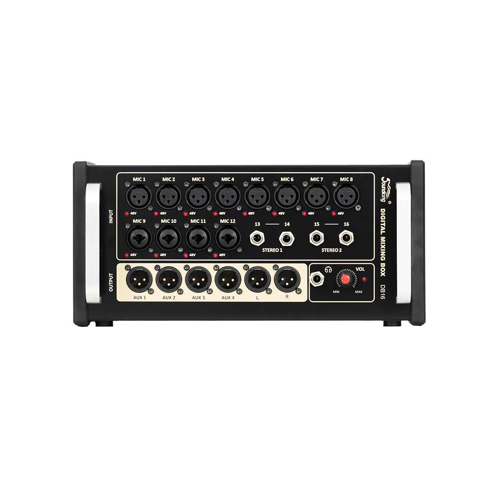 DB16機(jī)架式數(shù)字黑盒調(diào)音臺,19”標(biāo)準(zhǔn)機(jī)架安裝。它融合了現(xiàn)代數(shù)字調(diào)音臺和傳統(tǒng)箱式調(diào)音臺的全新理念。它小巧的身材,簡單的操作界面,專業(yè)的混音效果,既能夠在一場專業(yè)人士演出上發(fā)揮出色的能力,也能給充分滿足經(jīng)驗不足的個人用戶提供強(qiáng)大的效果。具有壓限器,效果器,分頻器,均衡器,以及常規(guī)模擬調(diào)音臺的功能,可以為客戶節(jié)省大量費用??缙脚_兼容iOS、安卓、Windows和Linux設(shè)備,最多可同時使用10臺控制設(shè)備。