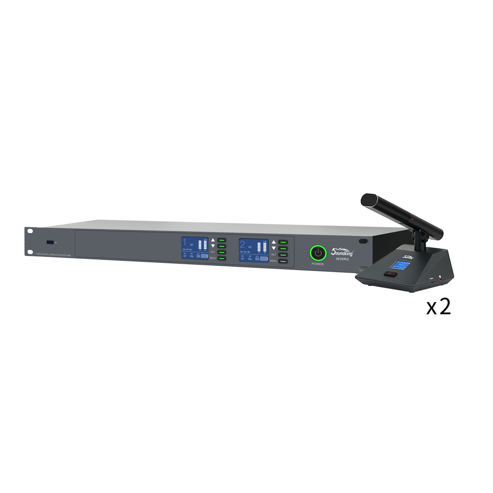 1. 一臺雙通道無線麥克風收發主機和2臺桌面會議式發射器組成的麥克風系統;