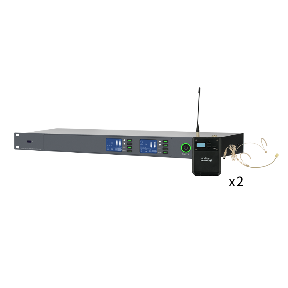 1. 一臺(tái)雙通道無線麥克風(fēng)收發(fā)主機(jī)和2臺(tái)腰包式發(fā)射器組成的麥克風(fēng)系統(tǒng);