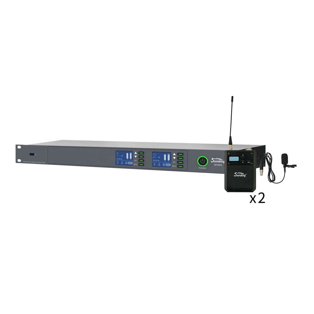 1. 一臺雙通道無線麥克風(fēng)收發(fā)主機和2臺腰包式發(fā)射器組成的麥克風(fēng)系統(tǒng);