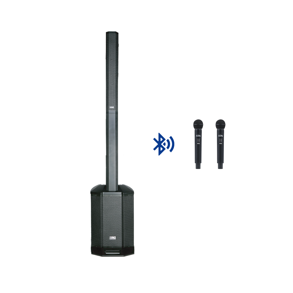 無線麥克風組合音響,一款由2只無線麥克風+1只6x3寸無源塑殼音柱+1只內嵌4路輸入帶雙通道功率放大器箱式調音臺的有源超低頻音箱+1只塑殼音柱支撐箱組成的一套高性能便攜式的自帶無線麥克風組合音響系統。三分頻的塑殼音柱內置,6x3寸全頻揚聲器+1寸壓縮驅動器號角揚聲器,其音質出色,重量輕,攜帶方便,恒指向性高音號角設計,聲場覆蓋均勻。12寸有源超低頻音箱,倒相式設計,內置2x300W雙通道功率放大器和4路輸入通道的箱式調音臺。其中調音臺包含2路MIC/LINE輸入,1路RCA立體聲混合線路輸入,1路HI-Z線路輸入,1路副箱信號輸出和超低頻音量控制。