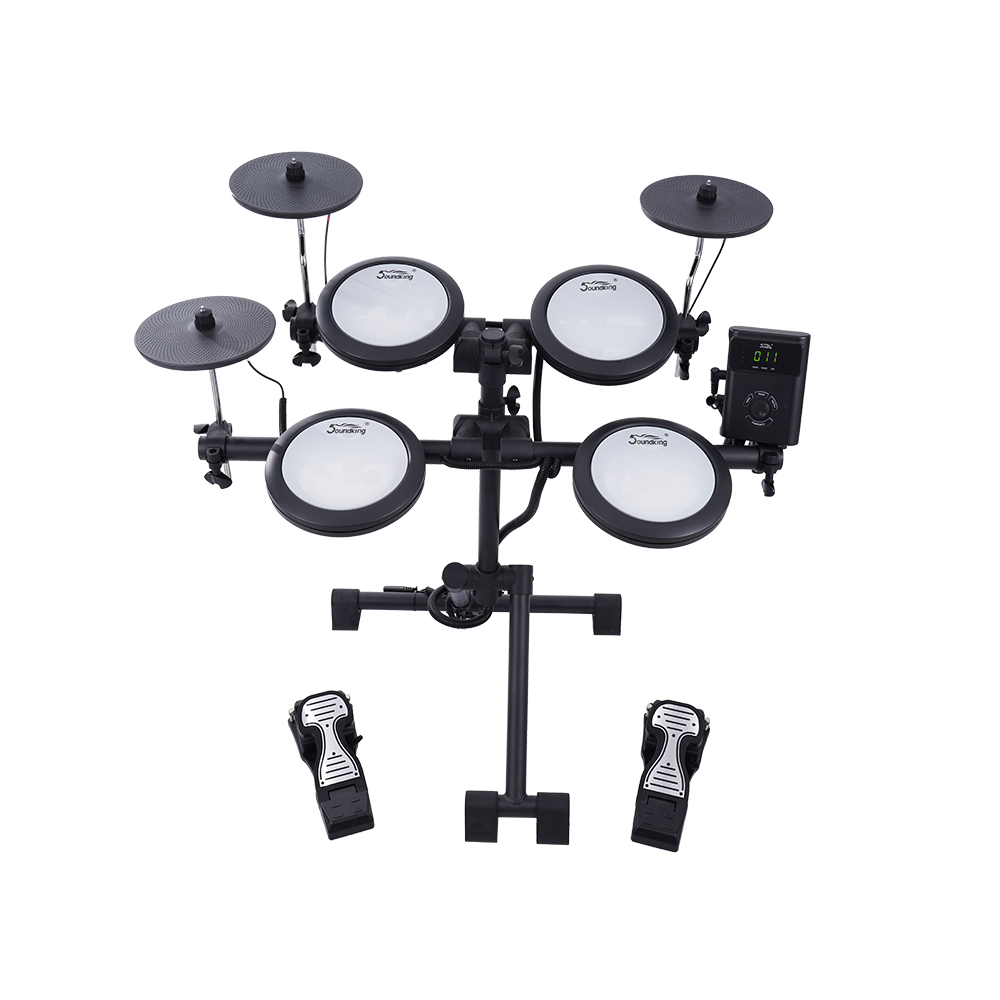 旅行網鼓 SD10M,鼓架采用音王專利的折疊支架,镲片采用兩次注塑工藝制作而成,經久耐用。軍鼓及嗵 鼓全部采用網皮鼓尺寸為7寸,所有都為單聲道。镲片采用全包膠,膠皮表面,尺寸為8寸, 全部為單通道。鼓盤和鈸镲調節部位采用S形旋鈕調節,收納方便。連接管采用獨家專利的 裝配方式,可完美隱藏線材做到外觀簡潔。