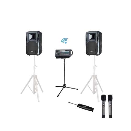 PAP10多功能便攜式組合音箱系統,包括一對10”無源塑殼音箱+一臺10路信號輸入帶功放箱式調音臺+2只無線麥克風。配上專用的音箱支架,就組成一套高性能的專業音箱系統。