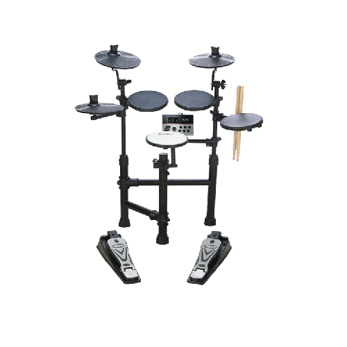 產品支架采用可折疊三腳支架,高度可調節,镲片采用鏤空設計,方便攜帶,采用標配5鼓3镲配置