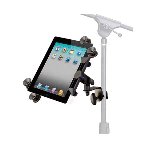多適用平板電腦支架,用于固定大部分尺寸型號的平板電腦,支架可以連接麥克風支架,用于表演,演講等場合,操作方便。