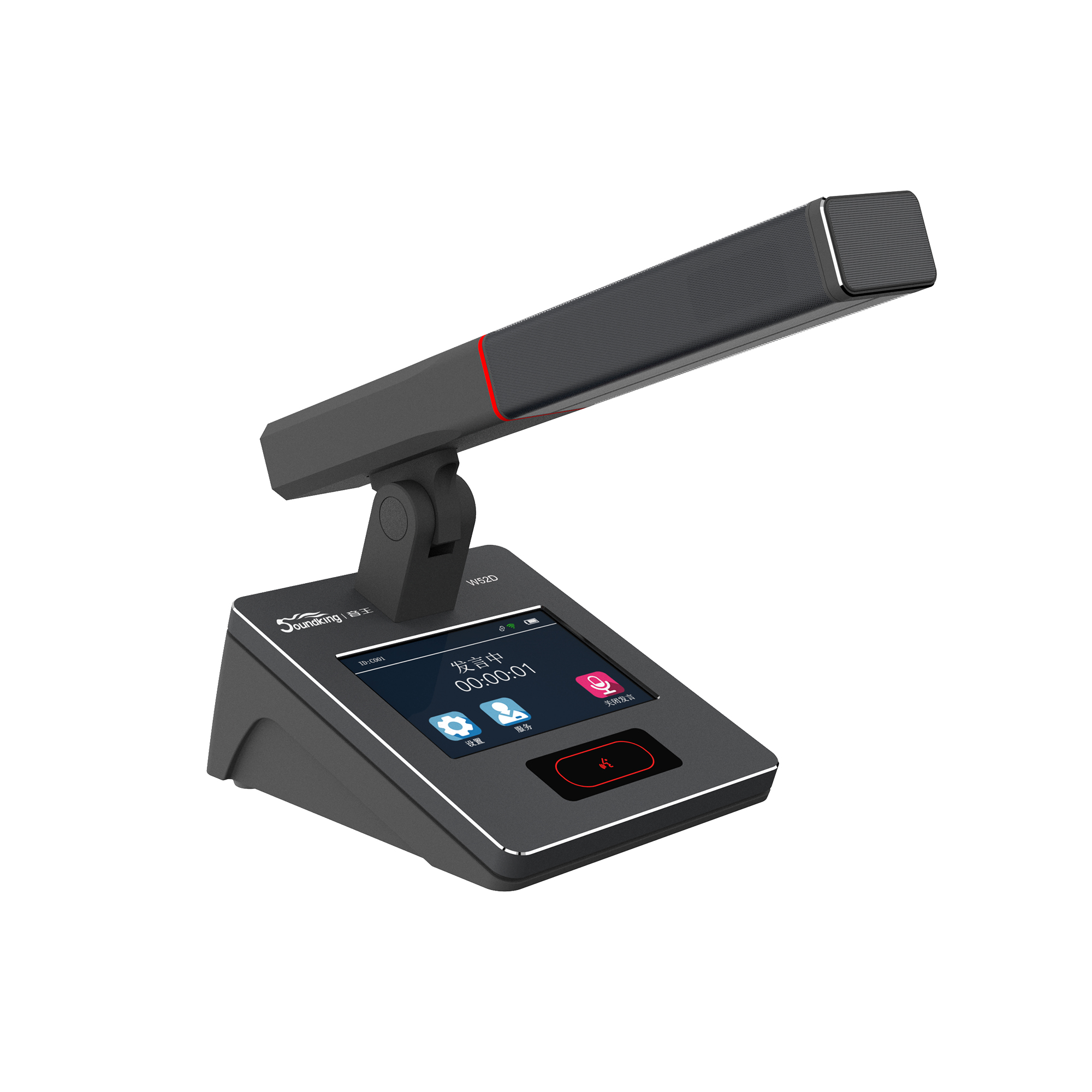 3. 紅綠雙色霧面指示燈設計,指示發言狀態。當紅色燈環亮時,表示正在發言,當綠色燈環亮時,表示申請等待發言