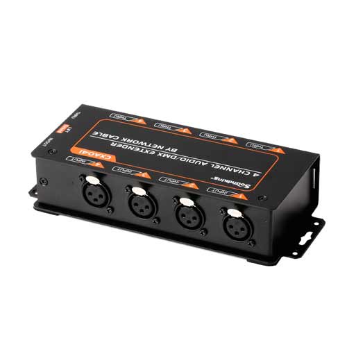 CXA041四通道音頻傳輸盒具有四個XLR-F輸入和四個XLR-M輸出并聯連接以及兩個并聯連接的RJ45型網絡連接器。使用一根網線替代四路音頻線或DMX燈光線,只需在任意兩個CXA041傳輸盒之間連接屏蔽Cat5以太網電纜即可以傳輸四路模擬音頻信號或AES數字音頻信號(注意網線必須是屏蔽線才能通過幻象電源),針對這一特性利用現有的Cat 5或Cat 6電纜基礎設施將音頻信號從建筑物的一個地方連接到另一個地方,或者使用廉價且輕便的網絡電纜長距離傳輸,它節約了成本并讓布線容易得多。設有接地開關能以幫助消除由接地回路引起的嗡嗡聲,除了傳輸音頻信號,也可傳輸燈光信號。